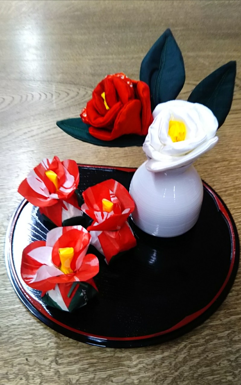 着物の布で作った椿を飾って、パシャ!