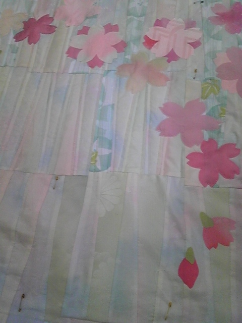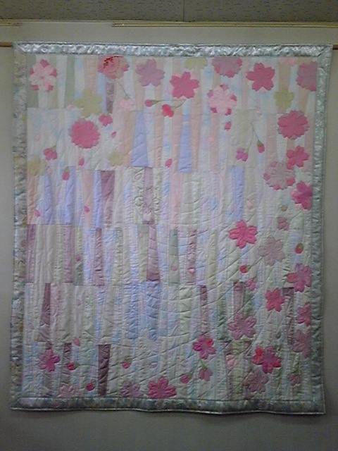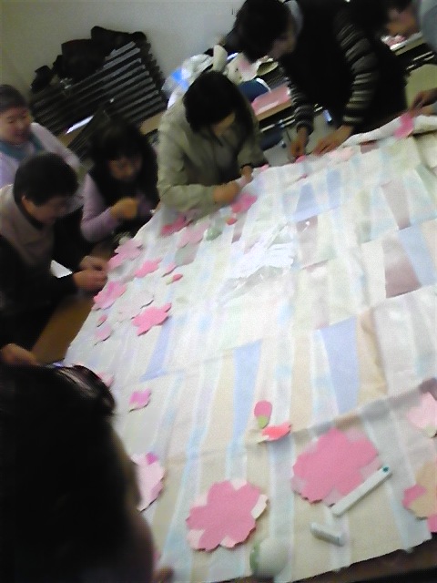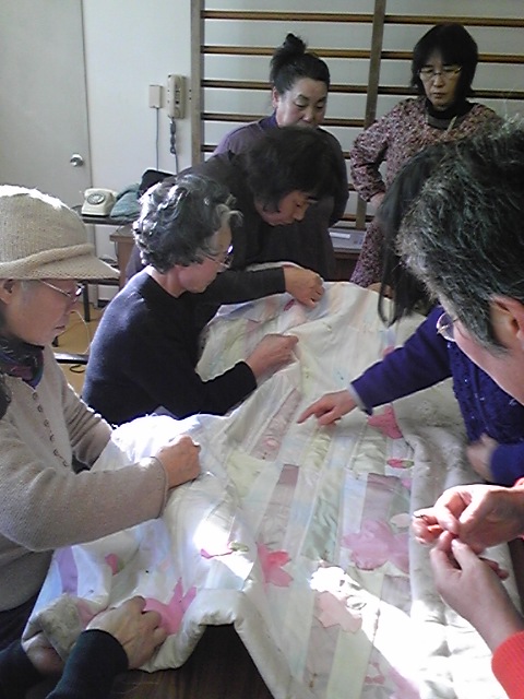 ただいま取り掛かっている作品は「さくら」がモチーフの大型タペストリーです。これは、被災地、岩手県野田村において地元のお母さん達に作って戴くキルトのプロジェクトです。3月11日までに完成予定で活動中!今年は7日から始まりです。時折、報告しまーす