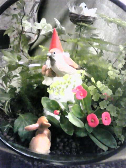 大きなガラス【直径40㎝くらい?】の中に小人が住む森を作りました。